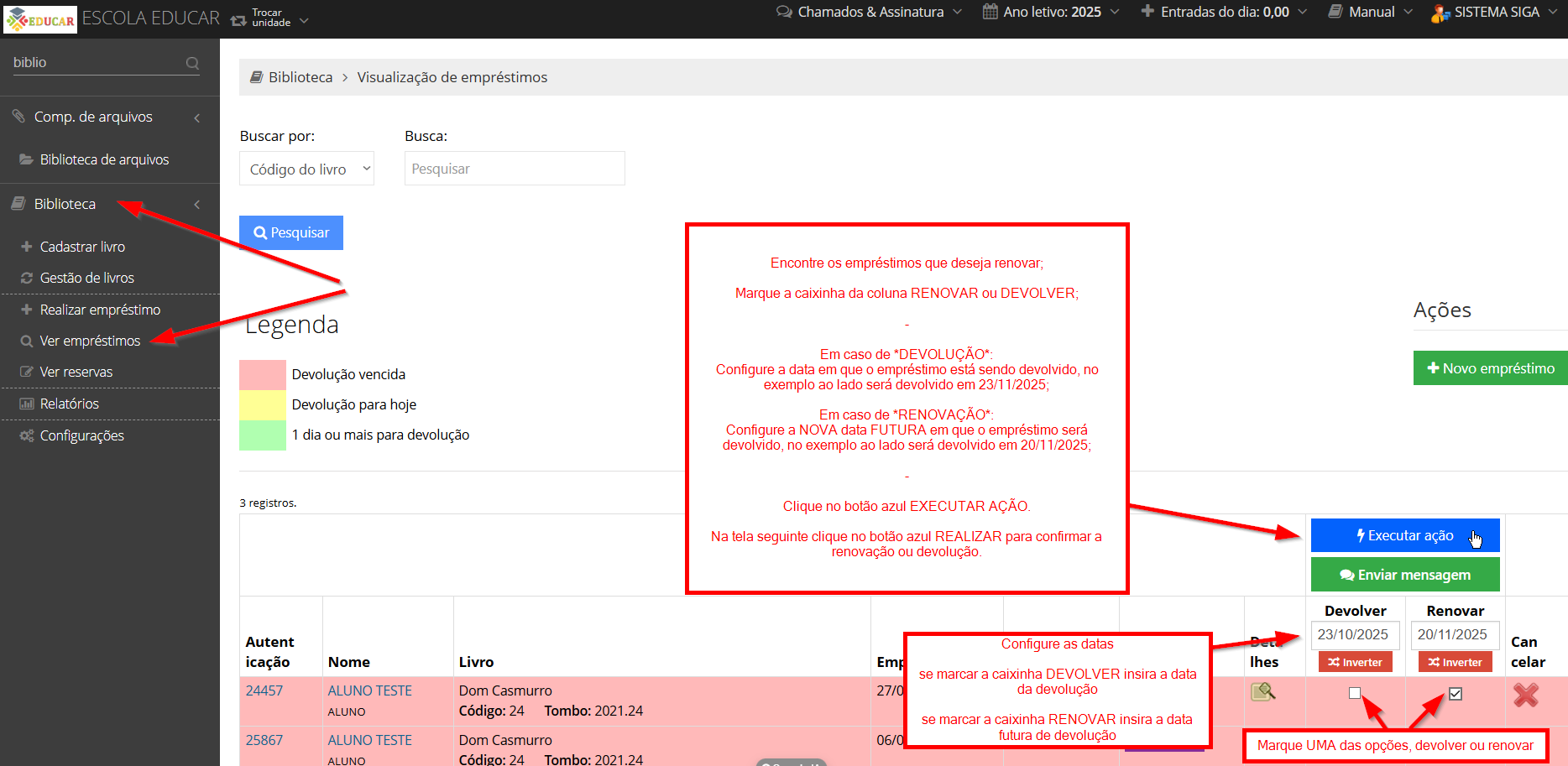 4. Observe que os empréstimos do aluno irão aparecer abaixo, no final da tabela existem as colunas "Devolver" e "Renovar"