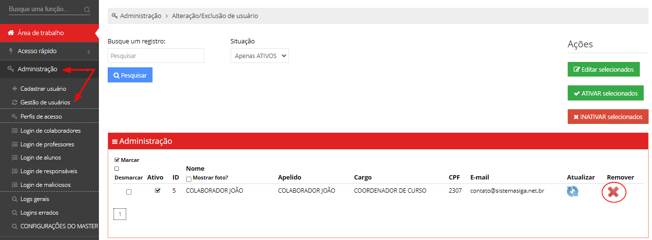 2. Encontre o usuário e clique no ícone da coluna remover para deletar o usuário do sistema.