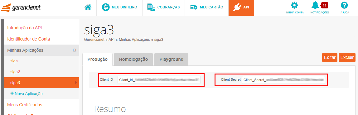 5. Serão geradas duas chaves ( Client ID e Client Secret) que serão utilizadas na integração com o sistema.